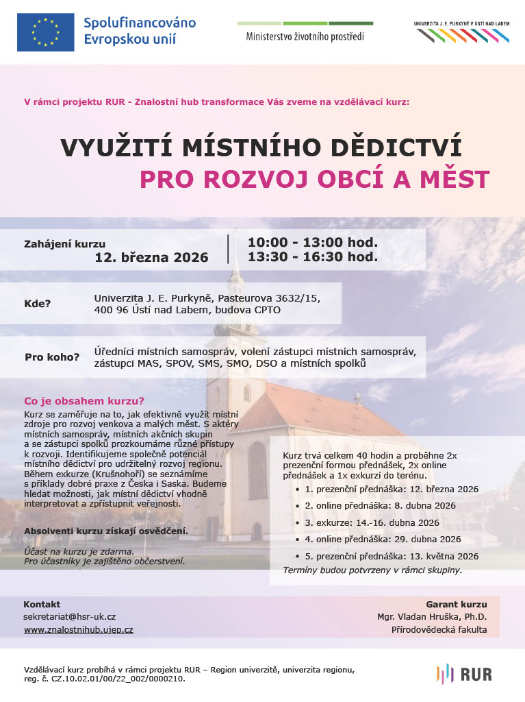 12. 3. 2026 se rozběhne jeden z výukových kurzů v rámci projektu RUR – region univerzitě, univerzita regionu, konkrétně aktivity KA2_C s názvem Využití místního dědictví pro rozvoj obcí a měst, který je realizován týmem z Katedry geografie Přírodovědecké fakulty.